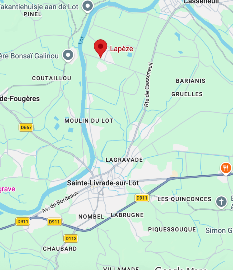 The community of Lapèze in relation to the town of Sainte-Livrade shown on Google maps