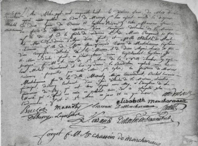 The Marriage Record of Jean Baptiste Lapaise de Védrines and Elisabeth de Moncharvaux at St. Anne de Fort de Chartres, courtesy of St. Joseph Church in Prairie du Rocher, IL.